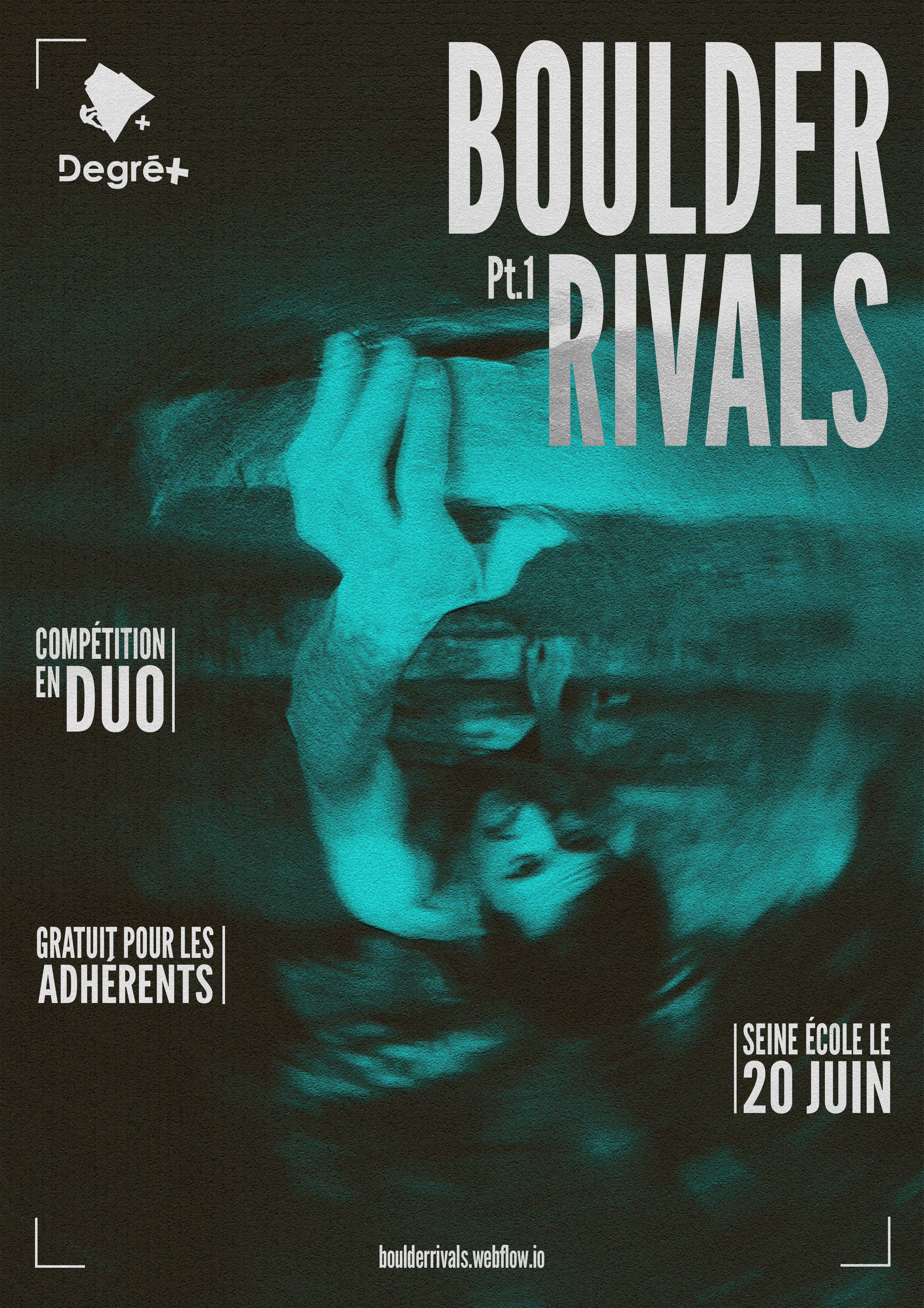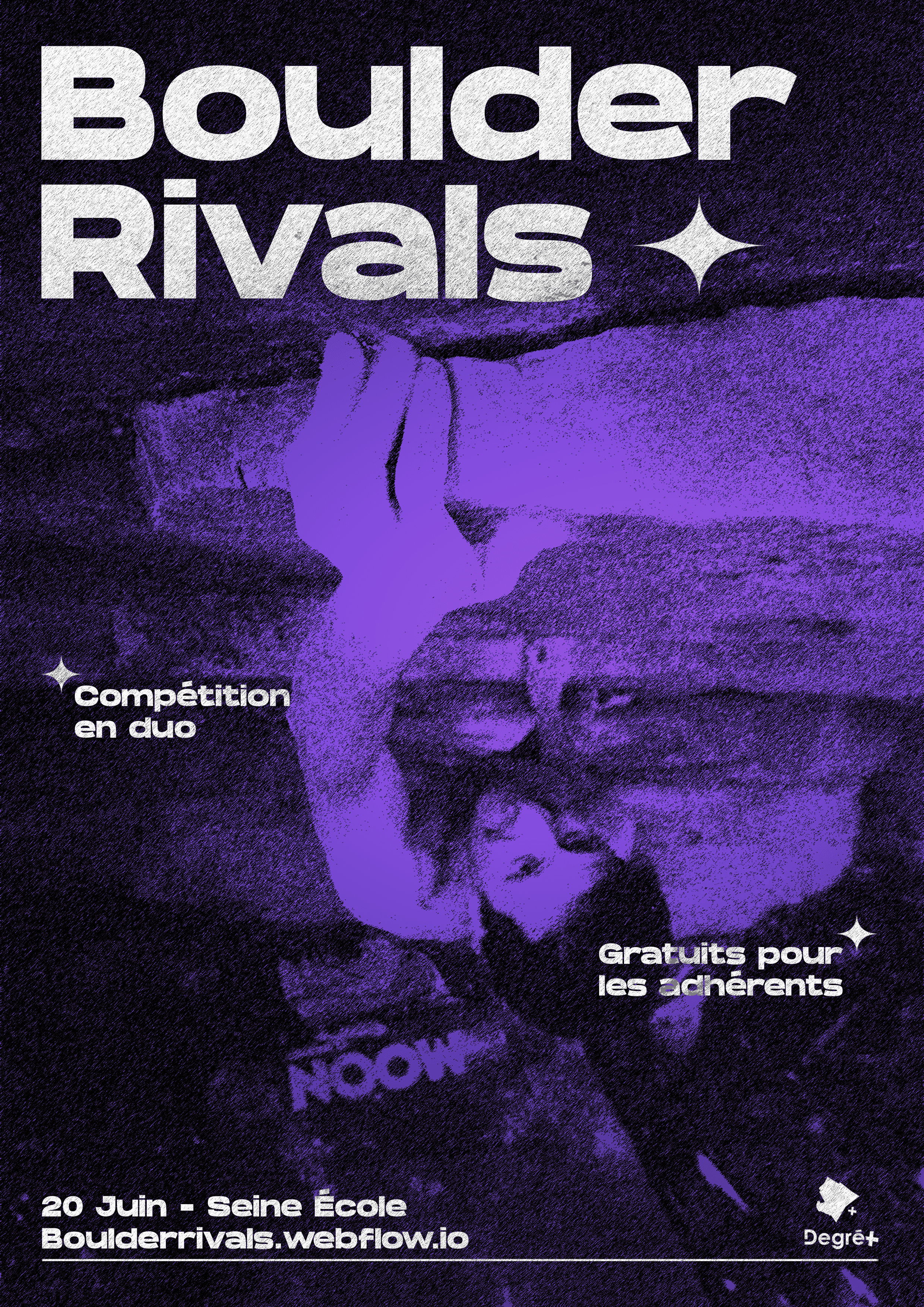 Pour la compétition interne en duo de Degré+, un club historiquement attaché à l'escalade en milieu naturel, l'objectif était de rajeunir leur communication. J'ai conçu une affiche à l'identité visuelle forte, pensée pour fédérer les adhérents et détonner dans le milieu classique de la grimpe, à l'image des partis pris audacieux de la salle canadienne "Bloc Shop". Sur les deux pistes créatives développées, c'est finalement la version bleue qui a été retenue pour porter ce vent de fraîcheur.