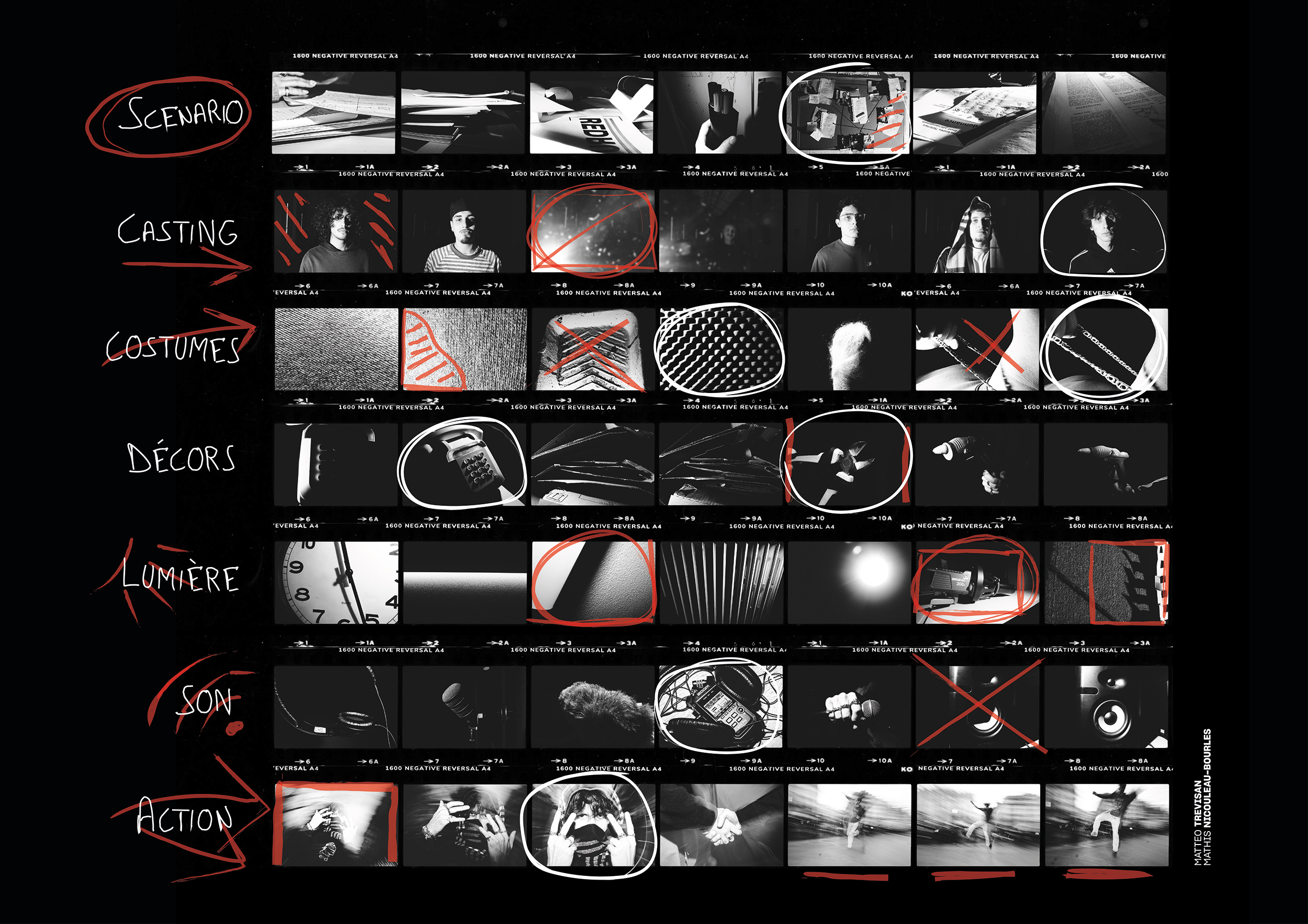 À l'occasion du Digital Event de l'ESD sur le thème du cinéma, Matteo Trevisan et moi avons documenté l'événement en créant une planche contact symbolique : 7 lignes de 7 clichés pour incarner le 7e art. Nous avons pris le contrepied de l'ambiance studieuse et lumineuse des ateliers en imposant une esthétique sombre, très contrastée et shootée au flash. Chaque ligne de la planche décompose une étape de la production, du scénario au tournage, offrant une vision brute et singulière du reportage photo.