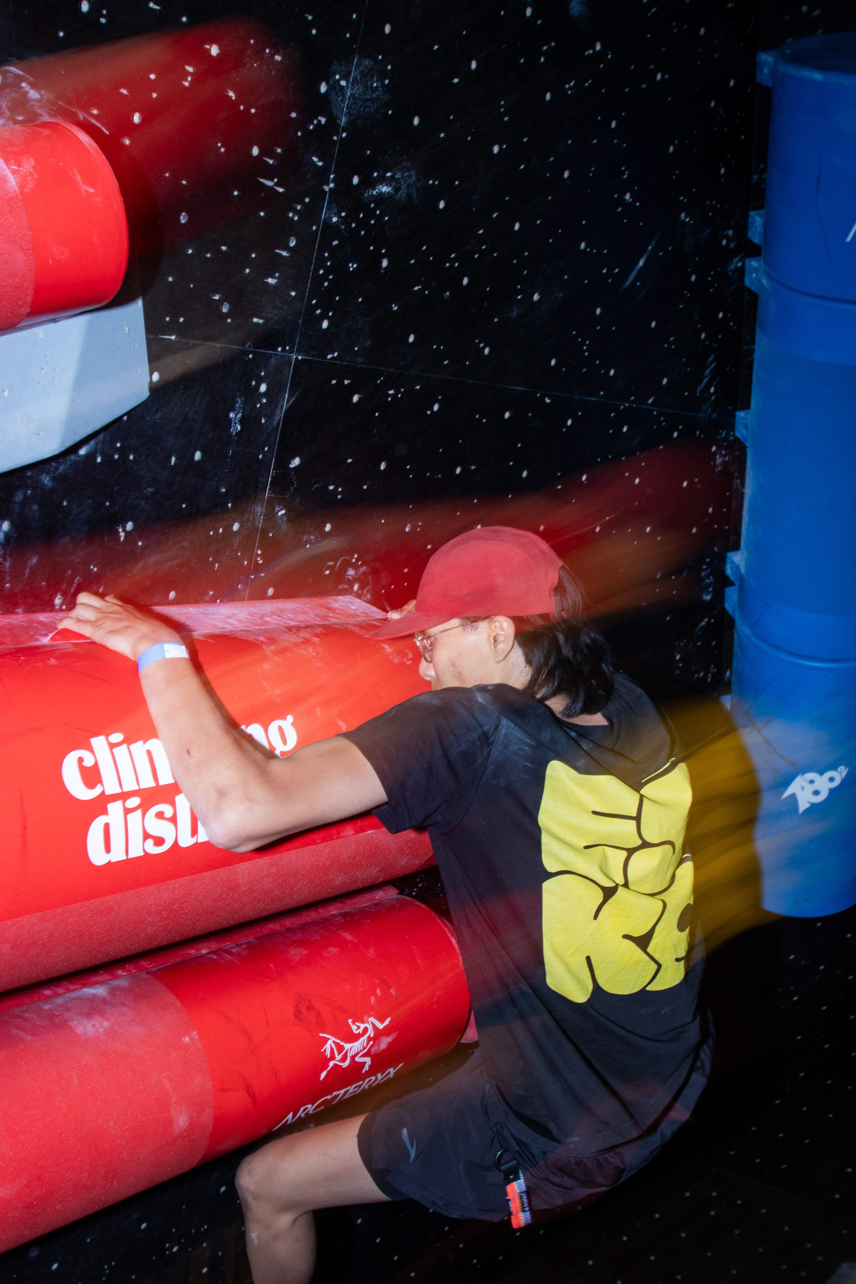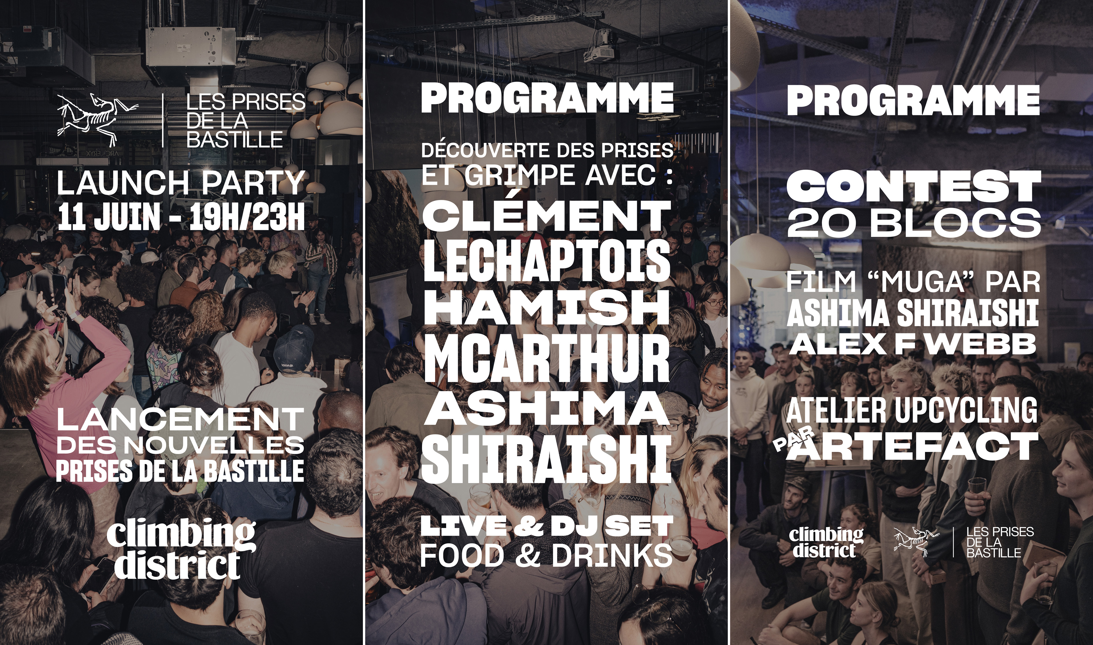 Pour la soirée annuelle Arc'teryx x Climbing District Bastille accueillant plus de 600 personnes, j'ai piloté la direction artistique et le graphisme promotionnel avec le spécialiste image Tristan De Kersaint Gilly. Nous avons imaginé une vidéo teaser interrogeant les grimpeurs sur les futures prises, d'ailleurs reprise par Arc'teryx. J'ai ensuite adapté la communication post-événement avec des stories fidèles à l'identité de la salle. Enfin, j'ai conçu toute la signalétique pour fluidifier l'expérience sur place, tout en capturant l'énergie de la soirée via des photos au flash déporté.