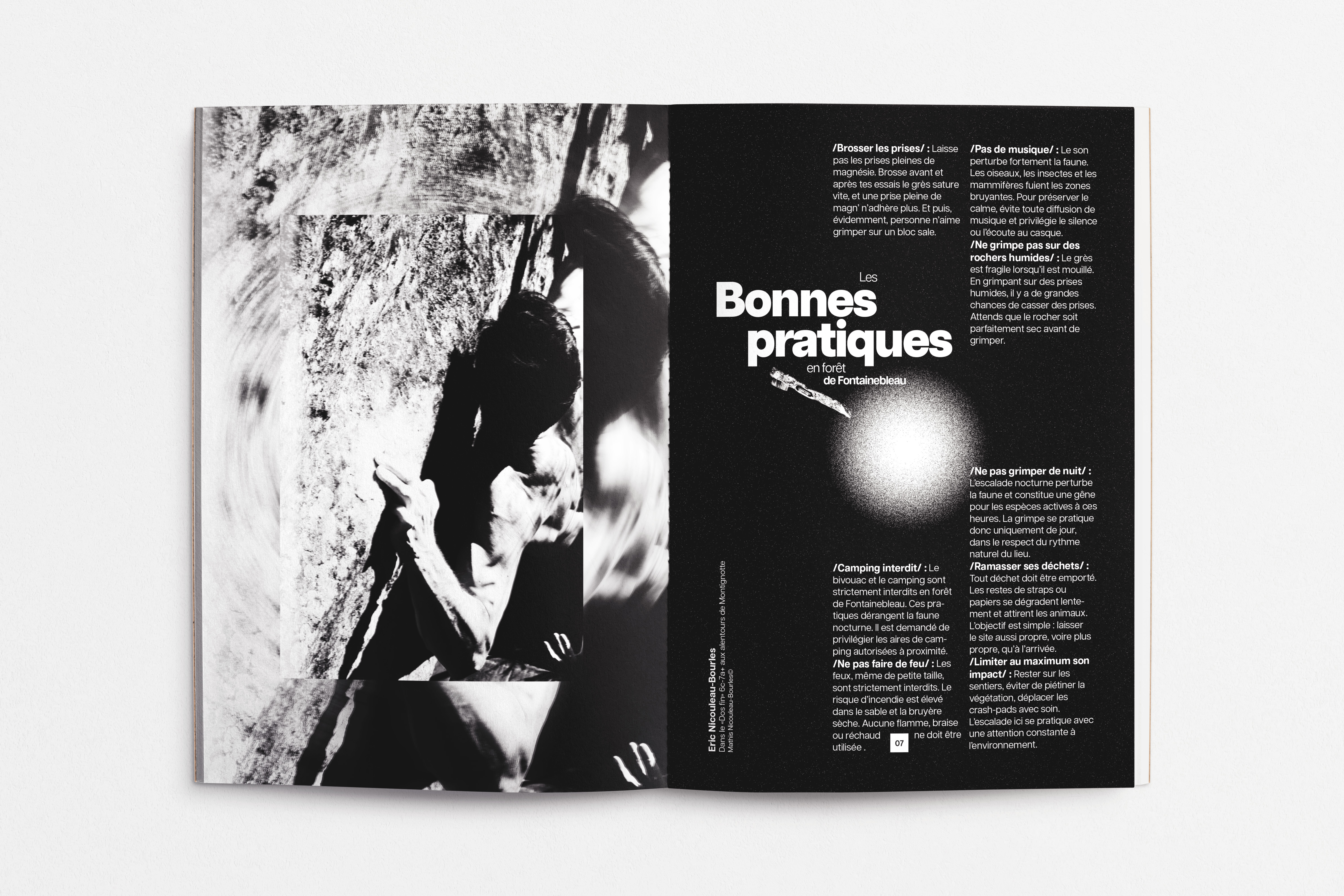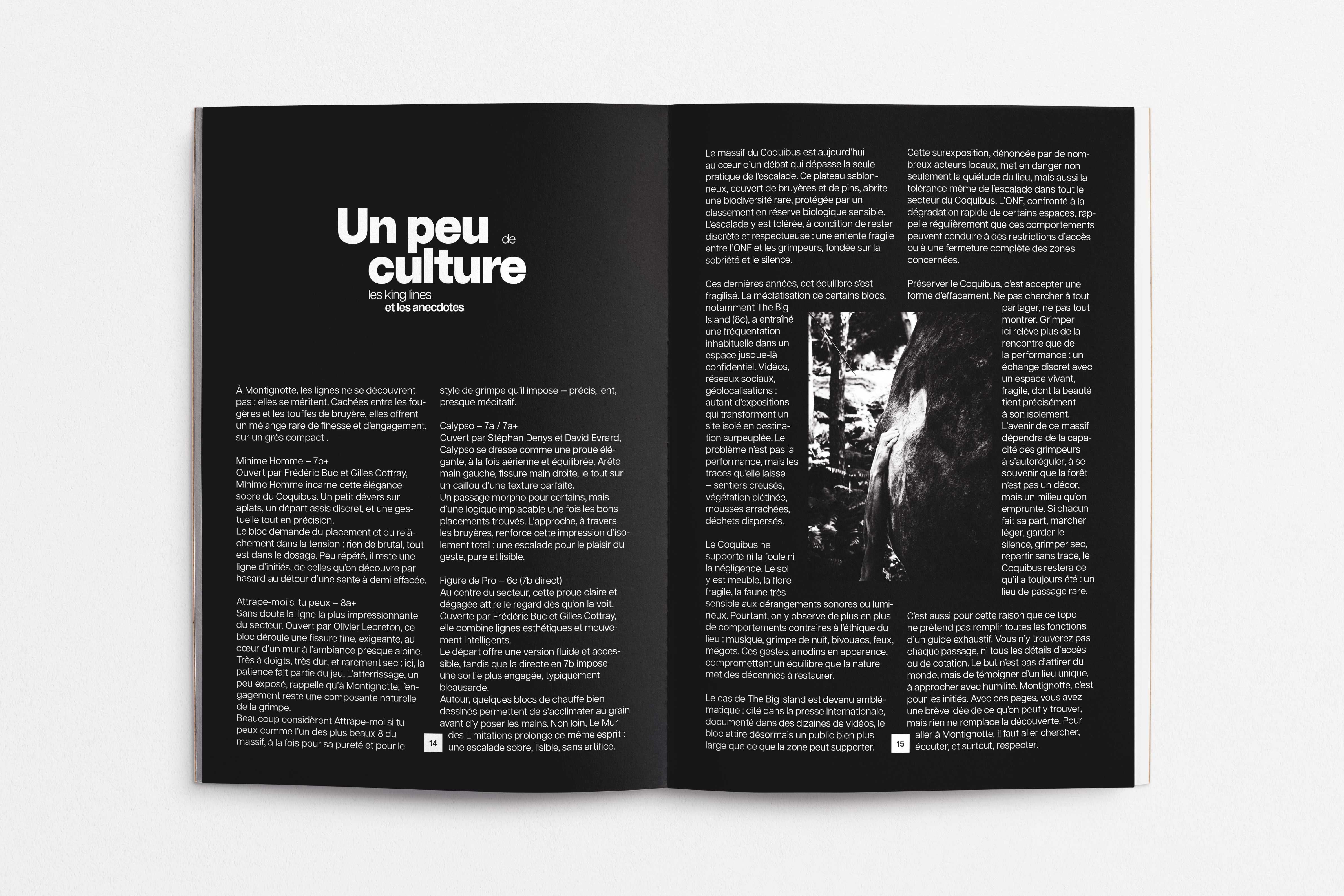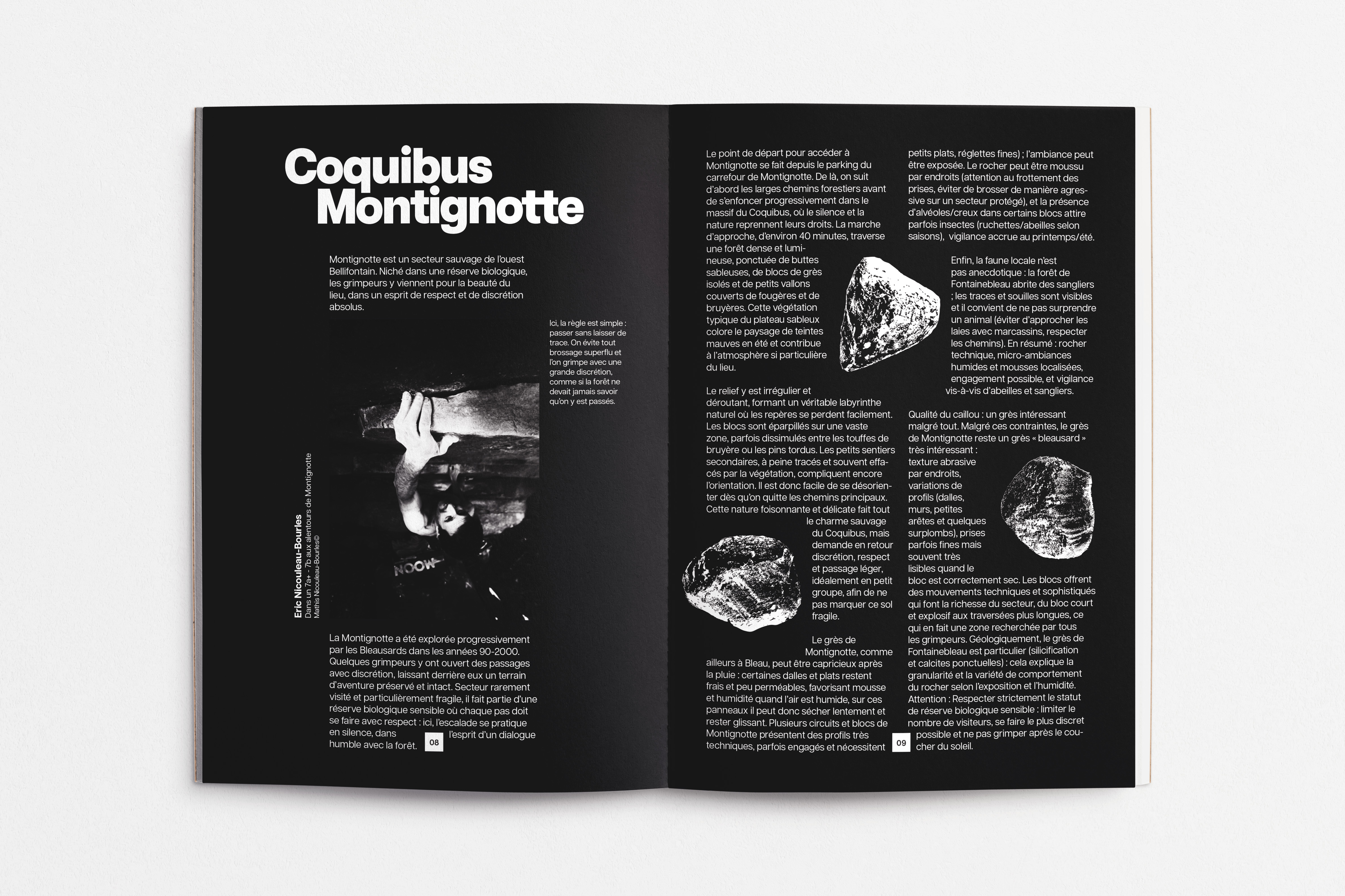 Ce projet est un topo d’escalade dédié au secteur de Montignotte, un lieu isolé et préservé du massif du Coquibus, en forêt de Fontainebleau. Réalisé de manière indépendante, il associe direction artistique, photographie et design éditorial pour documenter un territoire où la grimpe se pratique dans le respect du vivant et du silence. S’il pourrait encore être développé pour devenir un véritable outil technique, ce topo a surtout été pensé comme un objet éditorial, proche du "coffee table book". Il ne cherche pas à guider le lecteur, mais à partager une vision sensible et préservatrice de la forêt. Loin d’une approche de consommation du milieu naturel, il valorise une relation plus attentive et respectueuse au paysage. Ce projet personnel m’a offert un espace d’expérimentation graphique et de recherche sur la composition.