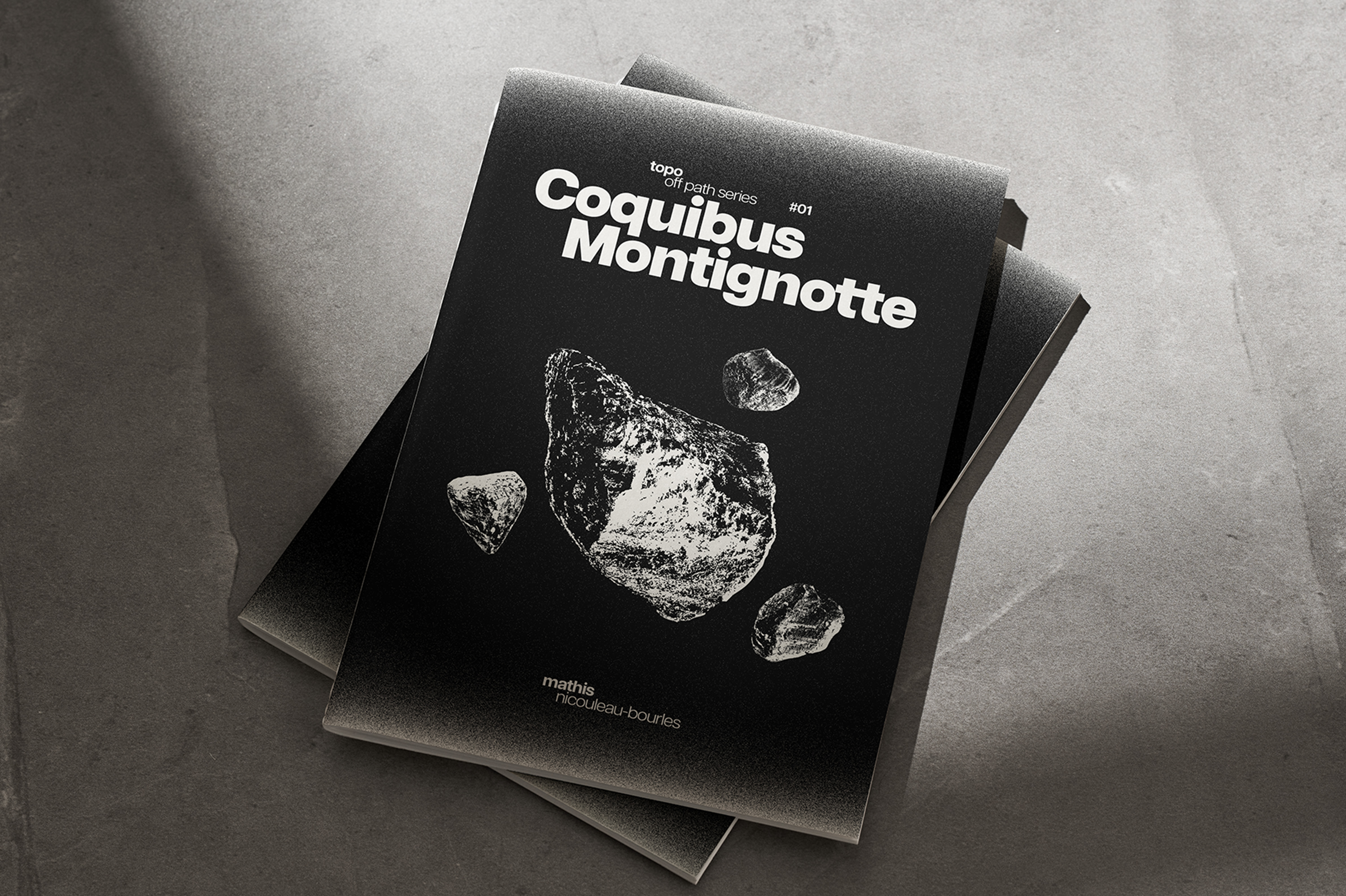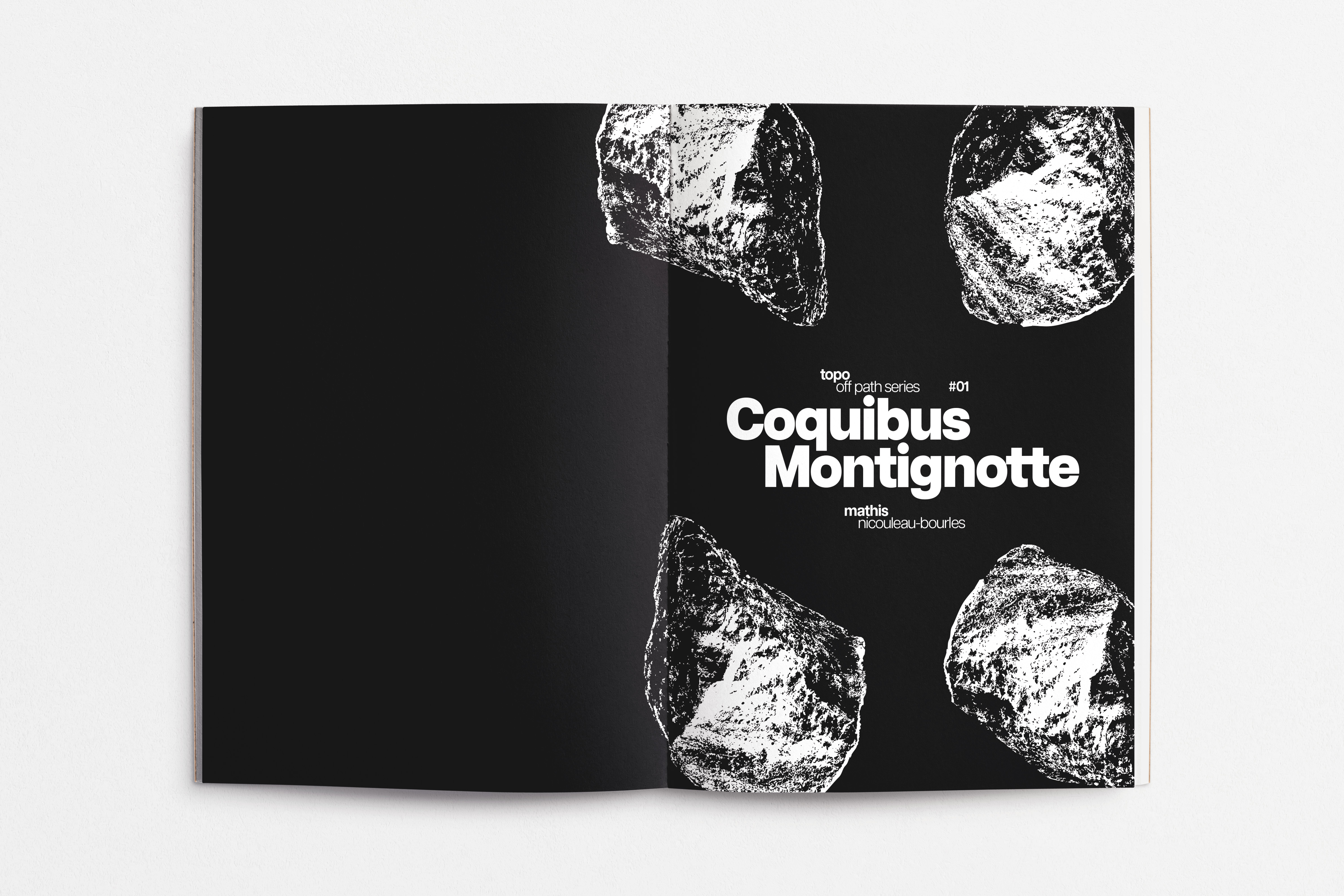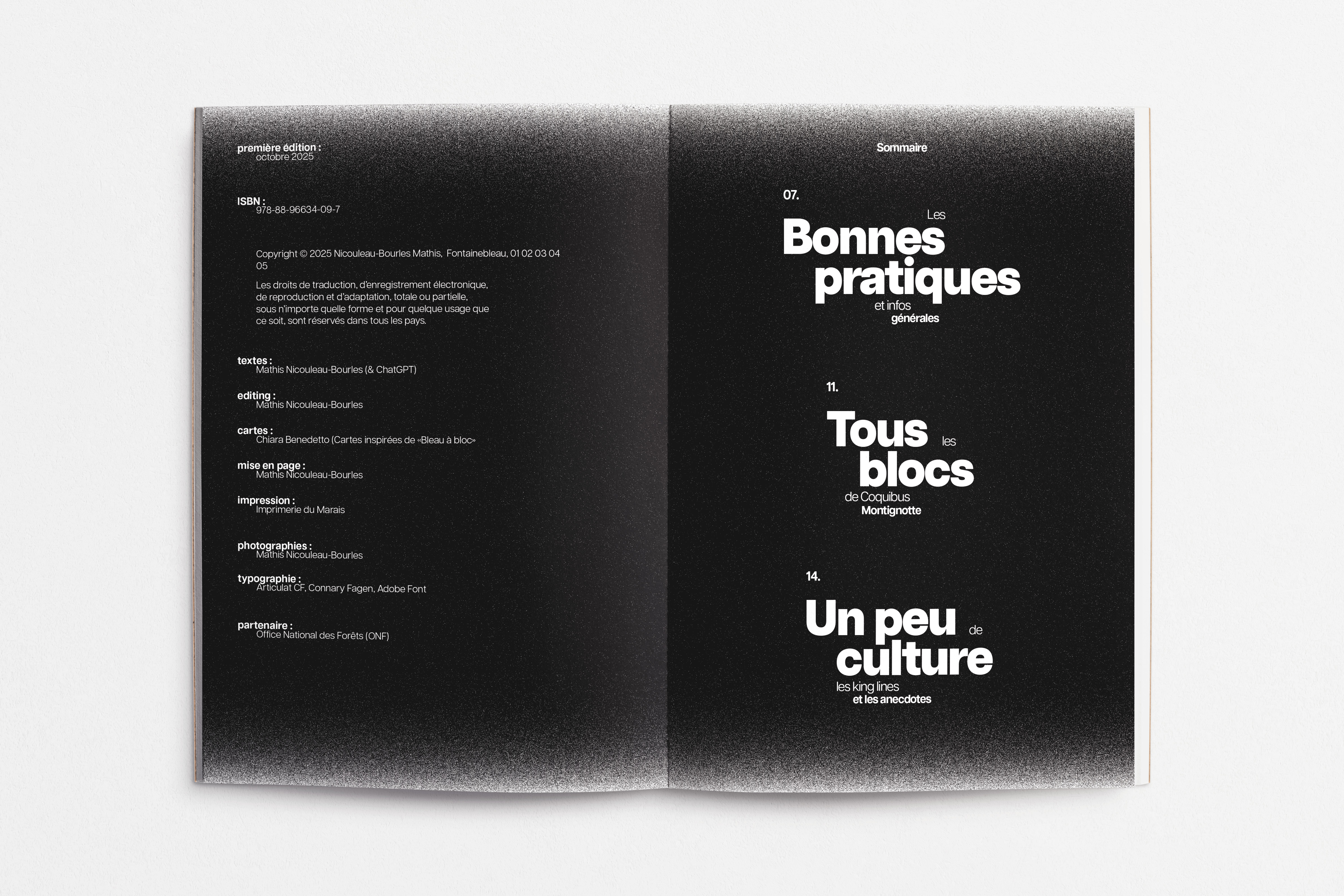 Ce projet est un topo d’escalade dédié au secteur de Montignotte, un lieu isolé et préservé du massif du Coquibus, en forêt de Fontainebleau. Réalisé de manière indépendante, il associe direction artistique, photographie et design éditorial pour documenter un territoire où la grimpe se pratique dans le respect du vivant et du silence. S’il pourrait encore être développé pour devenir un véritable outil technique, ce topo a surtout été pensé comme un objet éditorial, proche du "coffee table book". Il ne cherche pas à guider le lecteur, mais à partager une vision sensible et préservatrice de la forêt. Loin d’une approche de consommation du milieu naturel, il valorise une relation plus attentive et respectueuse au paysage. Ce projet personnel m’a offert un espace d’expérimentation graphique et de recherche sur la composition.